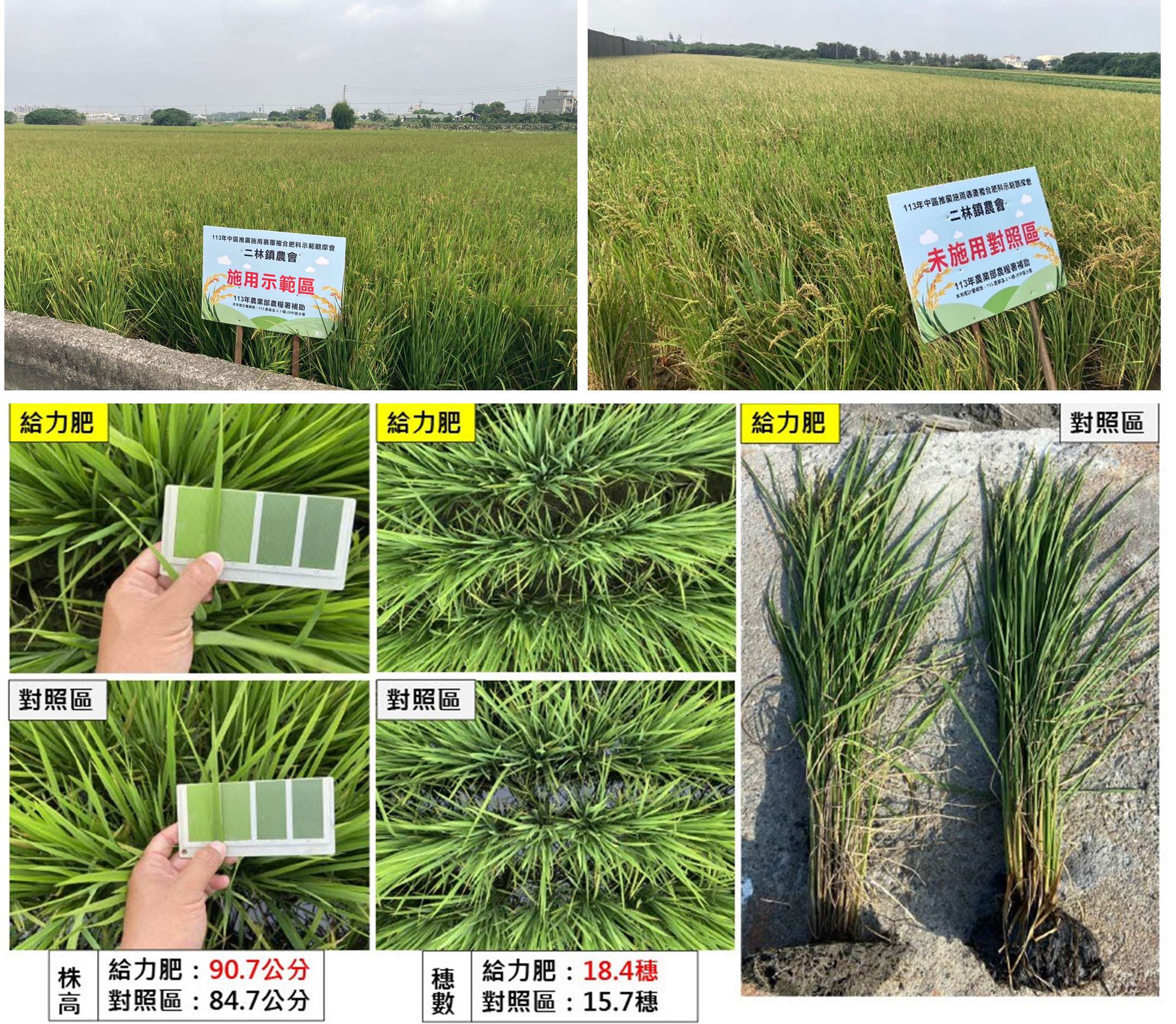 圖二:113年彰化縣二林鎮二期水稻裹覆肥(給力肥1號)施用示範及對照田區試驗結果。