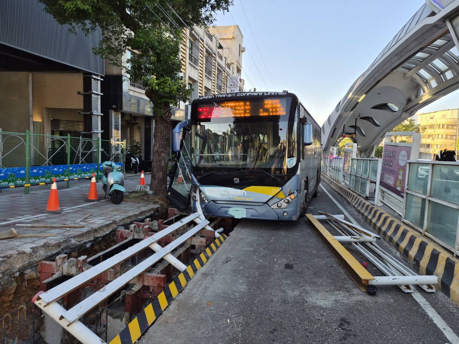 【記者楊川欽台中報導】一名台中市公車司機,在行經沙鹿區台灣大道七段81號前,因未注意前方路況,導致右前車頭擦撞路邊施工護欄,導致車身陷於施工的工地中而動彈不得,所幸車上午只有一名乘客,駕駛與乘客也都未受傷,清水警分局獲悉後前往調查責任歸屬並維持交通安全。
