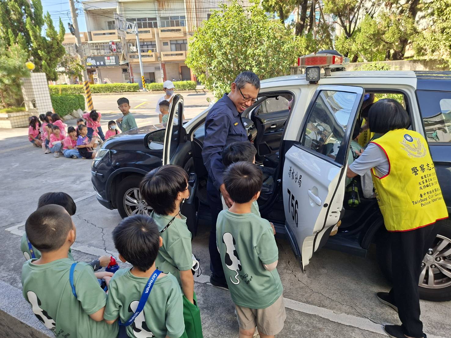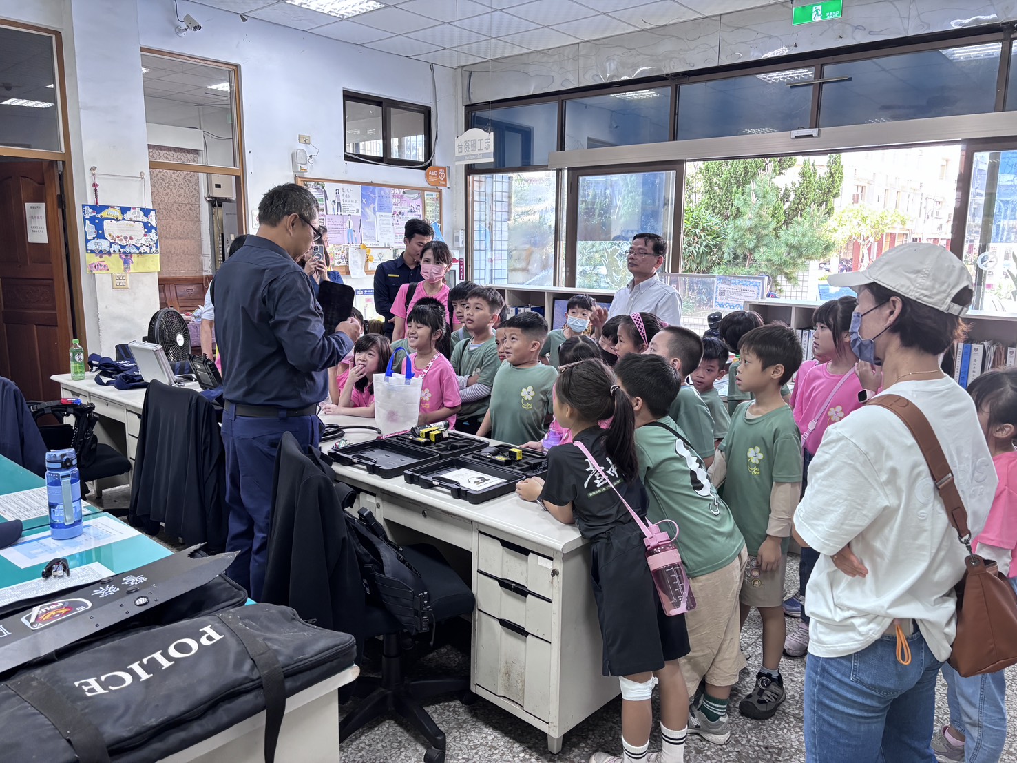 清水警分局明秀所副所長甘致宇與警員蔣承志、曾裕翔特別將防彈衣、酒測器、電擊槍、指揮棒等警用裝備一一展示,並讓學童穿上防彈衣、體驗取締酒測流程,加上警方生動有趣互動方式講解,讓小朋友身歷其境感受警察執勤的辛勞,其中有小朋友舉手向副所長反映「可以坐警車嗎,我阿媽坐過喔,因為不知道路,警察把她載回家喔」,警方也準備一部警車,並講解車上各種裝備及功能,警方隨即開啟警示燈及警笛的功能,讓現場小朋友驚呼連連。