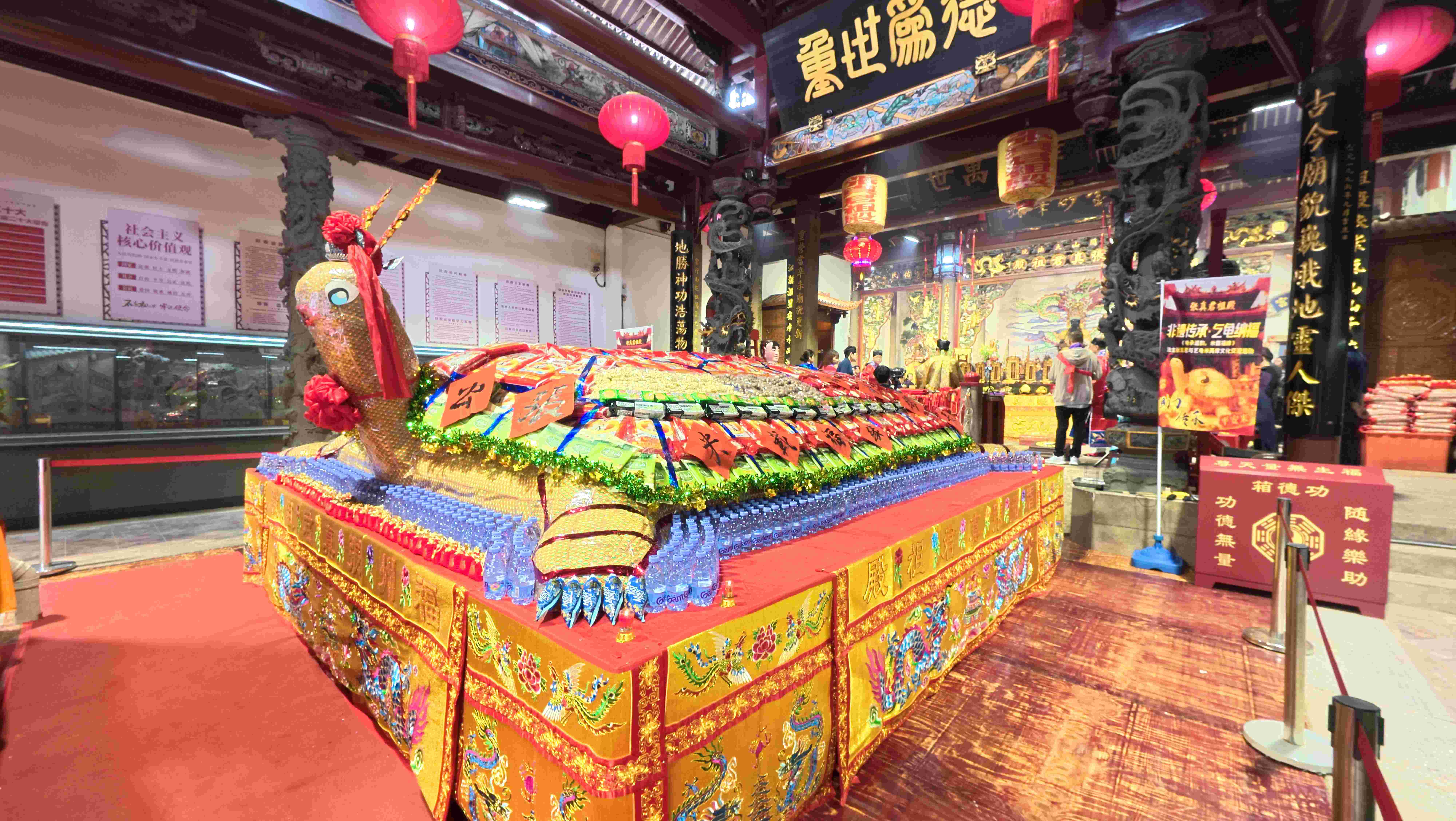 【記者楊川欽專題報導】一隻由8444公斤大米堆成的巨型米龜,於11月15日在大陸福建福州市上下杭張真君祖殿亮相,吸引大批市民遊客信眾圍繞米龜祈願,瞭解張聖君傳說和「米龜祈福」民俗,感受中華傳統文化的魅力,這是臺灣米龜薪傳人蕭慶鶴傳承工匠團隊為了張真君與乞龜米文化交流活動,首次應邀在大陸製作,彰顯兩岸民俗文化的深度交融與情感共鳴,巨型米龜將持續展示至12月22日,當日上午十時將舉行起龜活動,上下杭張真君祖殿管委會林原生道長歡迎各界人士來打卡祈福,及參加起龜活動將福氣帶回家。